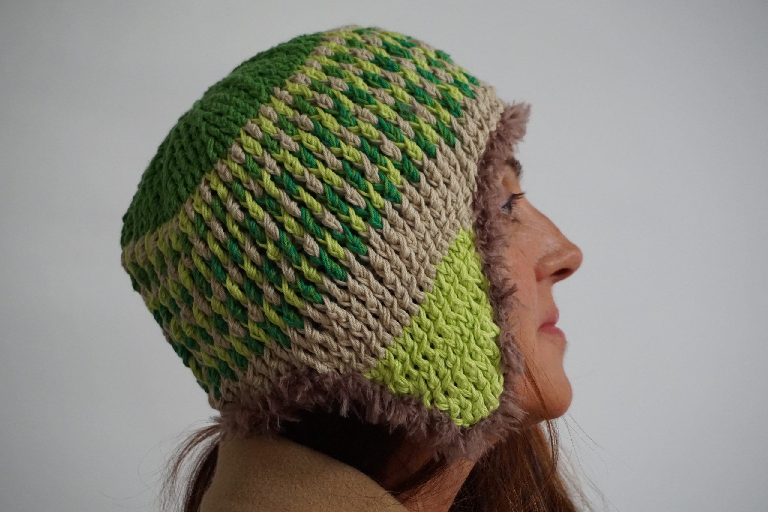 Joli bonnet aux tons verts en coton et acrylique rehaussé de fil fourrure tout doux. Bien épais grâce à son double point au crochet.