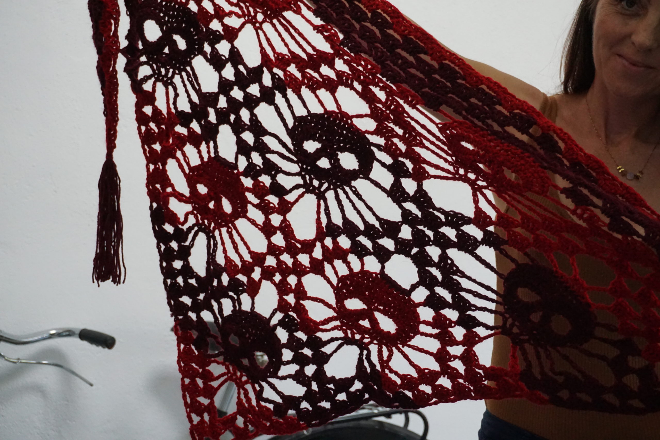 Pour les fan d’Halloween et des têtes de mort. Joli châle / chèche réalisé en acrylique (ne gratte jamais), chaud pour l’automne et l’hiver. Le motif reste discret porté en chèque.